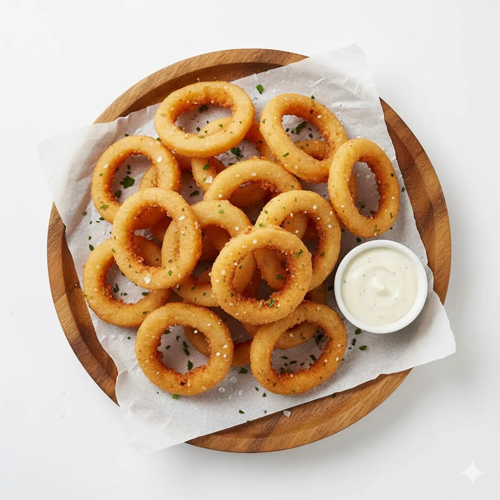 Crispy golden onion rings served hot and crunchy. Perfect as a side or snack. Lightly seasoned for a mouthwatering taste.